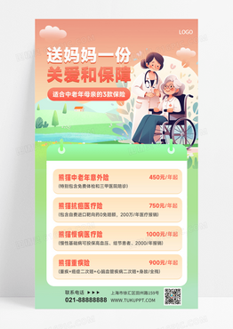 活动促销插画风格送妈妈一份关爱和保障保险手机宣传海报