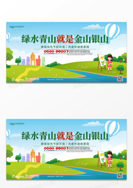 清新卡通绿水青山就是金山银山绿色生态环保展板