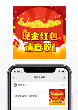 扁平手绘红色现金红包金币请查收公众号次图电商促销海报