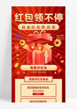 红色简约红包礼盒红包领不停 红包带回家活动长图手机ui长图