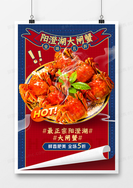 红蓝国潮风阳澄湖大闸蟹美食促销海报设计