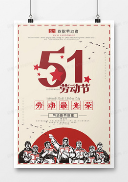 浅黄色一群劳动人民飞鸟五星劳动最光荣五一劳动海报