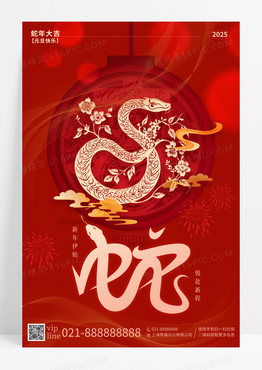 红色喜庆镂空剪纸蛇年2025年蛇年新年宣传海报