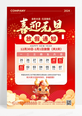 红色烫金风2024龙年元旦放假通知海报2024元旦新年