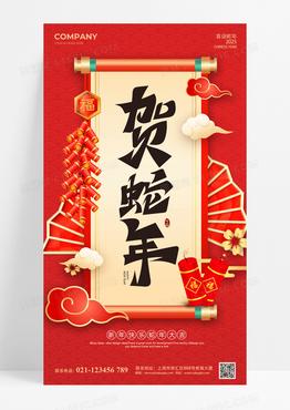 红色喜庆卷轴2025蛇年贺蛇年海报