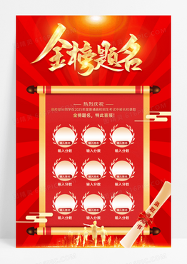 红底金字国潮国风折扇卷轴高考金榜题名荣誉榜海报