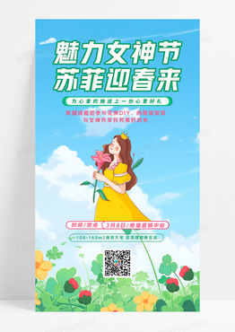 花草清新蓝绿简约水彩魅力女神节芳菲迎春来38妇女节手机文案海报