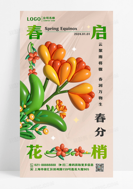 3D膨胀风春分花朵插画简约二十四节气手机宣传海报设计