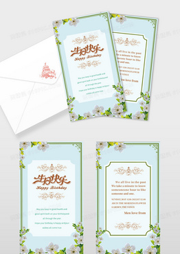 蓝色小清新手绘花朵贺卡金色字英文贺卡设计