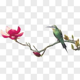 两只蓝绿粉颜色相间的小鸟停留在开黄色花朵的树枝上嬉国画风免抠元素