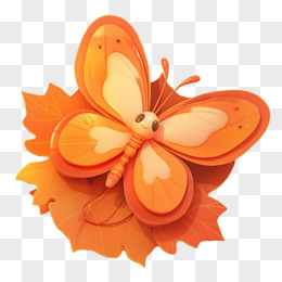 3D卡通黄色树叶上的可爱蝴蝶免抠元素