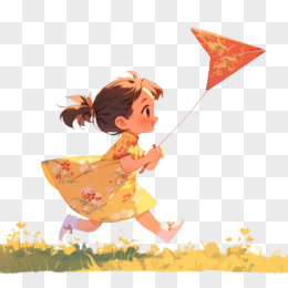 卡通穿黄色长裙的小女孩在草地放风筝免抠元素