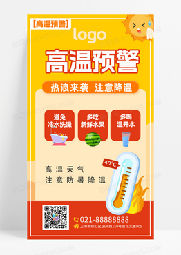 红色黄色渐变色扁平插画风格高温预警夏天防暑宣传海报夏天防暑手机宣传海报