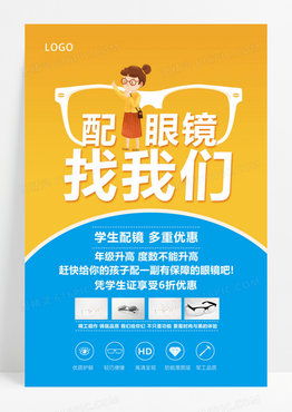 黄蓝色简约眼镜店配眼镜找我们促销宣传海报