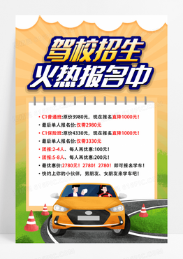 黄颜色背景卡通风格驾校报名开始啦驾校宣传海报驾校海报