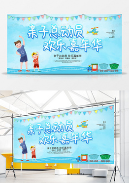 蓝色大气手绘亲子总动员欢乐嘉年华六一儿童节运动会宣传展板