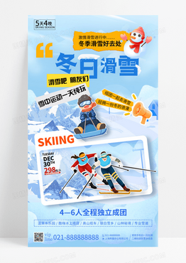 蓝色拼贴风冬日滑雪卡通冬日滑雪手机宣传海报