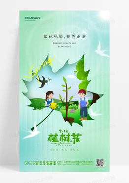 绿色312植树节叶片树叶剪影插画蝴蝶卡通创意手机宣传海报