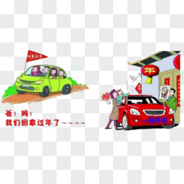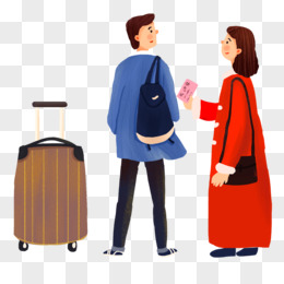 卡通手绘新年结伴回家在火车前自拍的女孩免抠元素