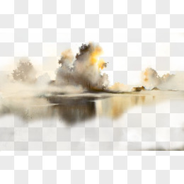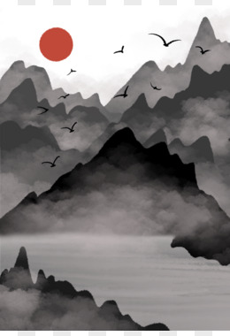 手绘水墨山水湖面插画元素