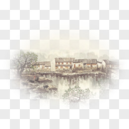 手绘免抠临江居家小船水墨画素材