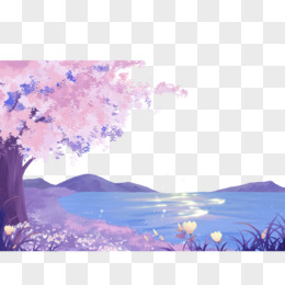 手绘唯美樱花树山川风景元素
