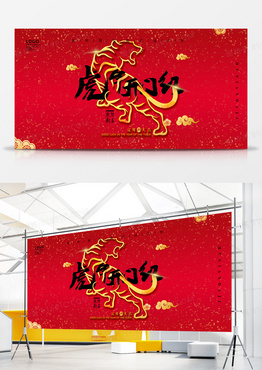 卡通手绘过年戴虎头帽的福娃击鼓场景素材