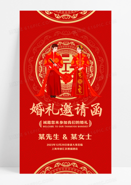 红色中式婚礼邀请函婚礼邀请函手机文案海报
