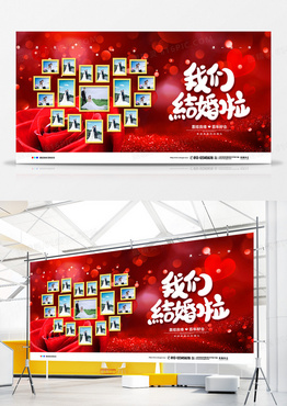 红色喜庆我们结婚啦婚纱照片墙展板设计