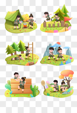 一组卡通手绘插画风学生军事夏令营项目合集元素