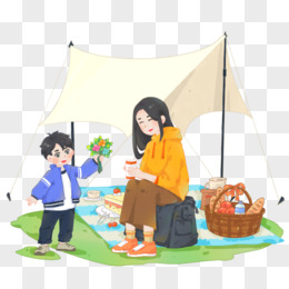 手绘卡通妈妈和孩子一起露营元素