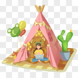 卡通手绘女孩在帐篷内场景素材
