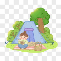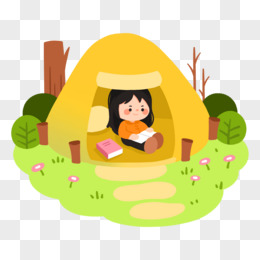 卡通野营小女孩帐篷里看书免抠元素