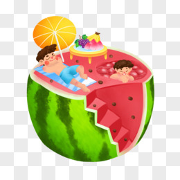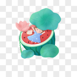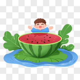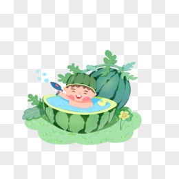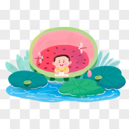 手绘卡通孩子在西瓜池里游泳免抠元素