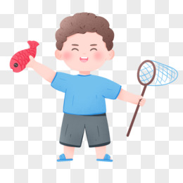 手绘男孩举着捕到的鱼元素