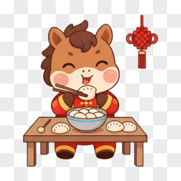 卡通手绘新年小马吃水饺免抠元素