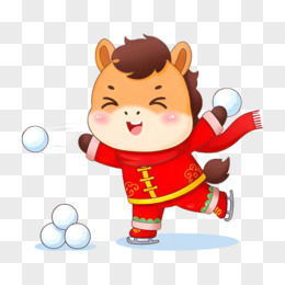 卡通手绘新年小马打雪仗免抠元素