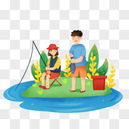 手绘卡通夏日钓鱼抓鱼场景免抠素材