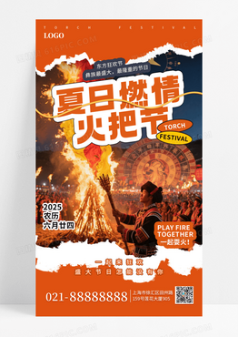 橙色撕纸风火把节少数民族节日手机海报海报素材