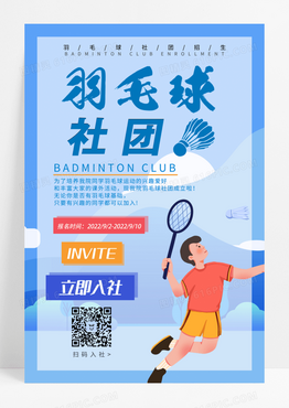 蓝色活力人物羽毛球社团招生活动宣传海报设计