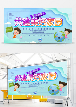 卡通创意创建文明城市共建美好家园展板javascript:;