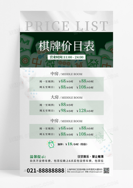 绿色大气棋牌价格表海报麻将棋牌室价目表海报