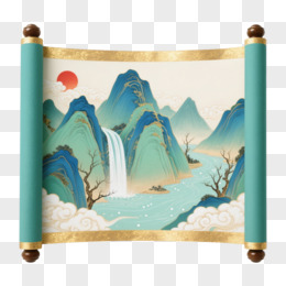 青绿山水卷轴国风工笔重彩元素