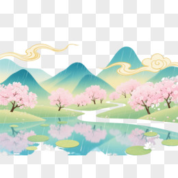 青绿山水祥云樱花中国风插画元素