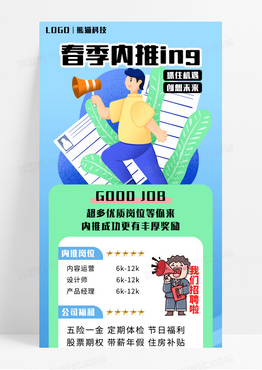 蓝色卡通手绘春季招聘有奖内推手机营销长图