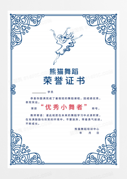 蓝色欧式边框舞蹈元素培训中心结业荣誉证书奖状舞蹈奖状