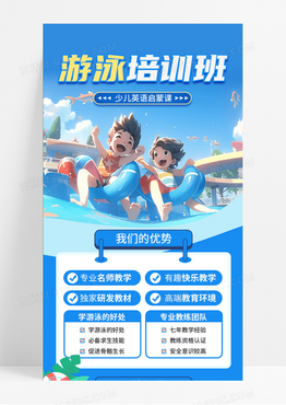 蓝色清新插画风儿童少儿游泳培训班3dh5长图