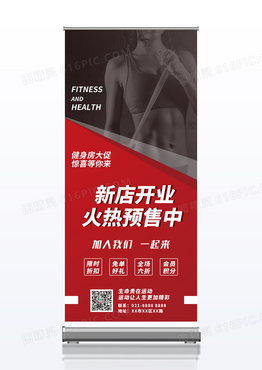 大红色新店开业健身展架健身房开业有礼展架易拉宝设计健身房开业展架