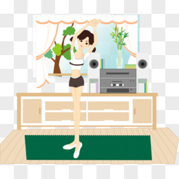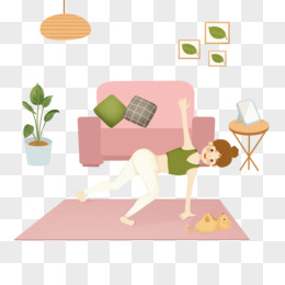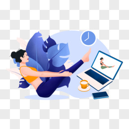 手绘女生跟着视频做瑜伽锻炼免抠素材