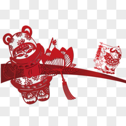 剪纸风小孩抱着红色大鲤鱼免抠元素